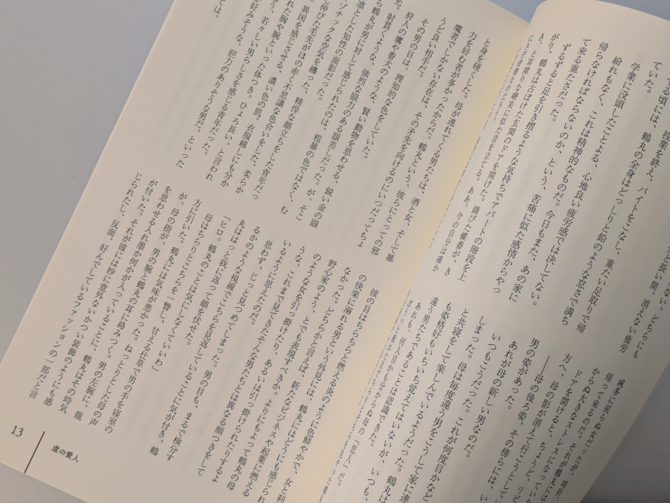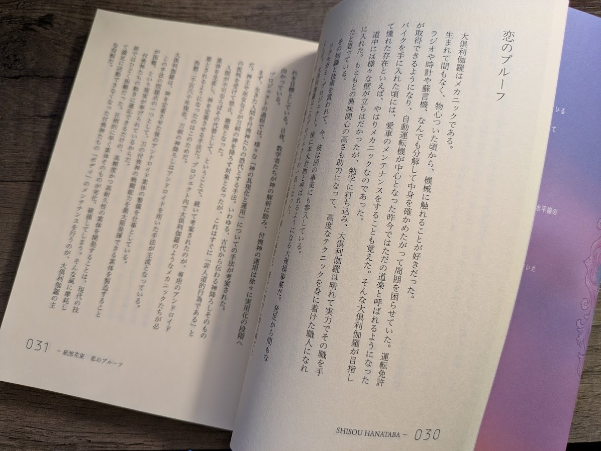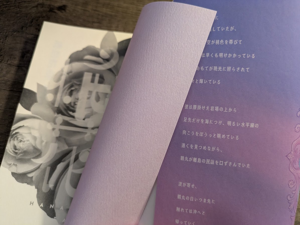 カバーも表紙も、濁らず綺麗に印刷していただきました。淡い紫色のマーメイド遊び紙で、表紙ともカバーとも違う手触りを楽しめて、本全体の色味も統一感が出て良かったです。