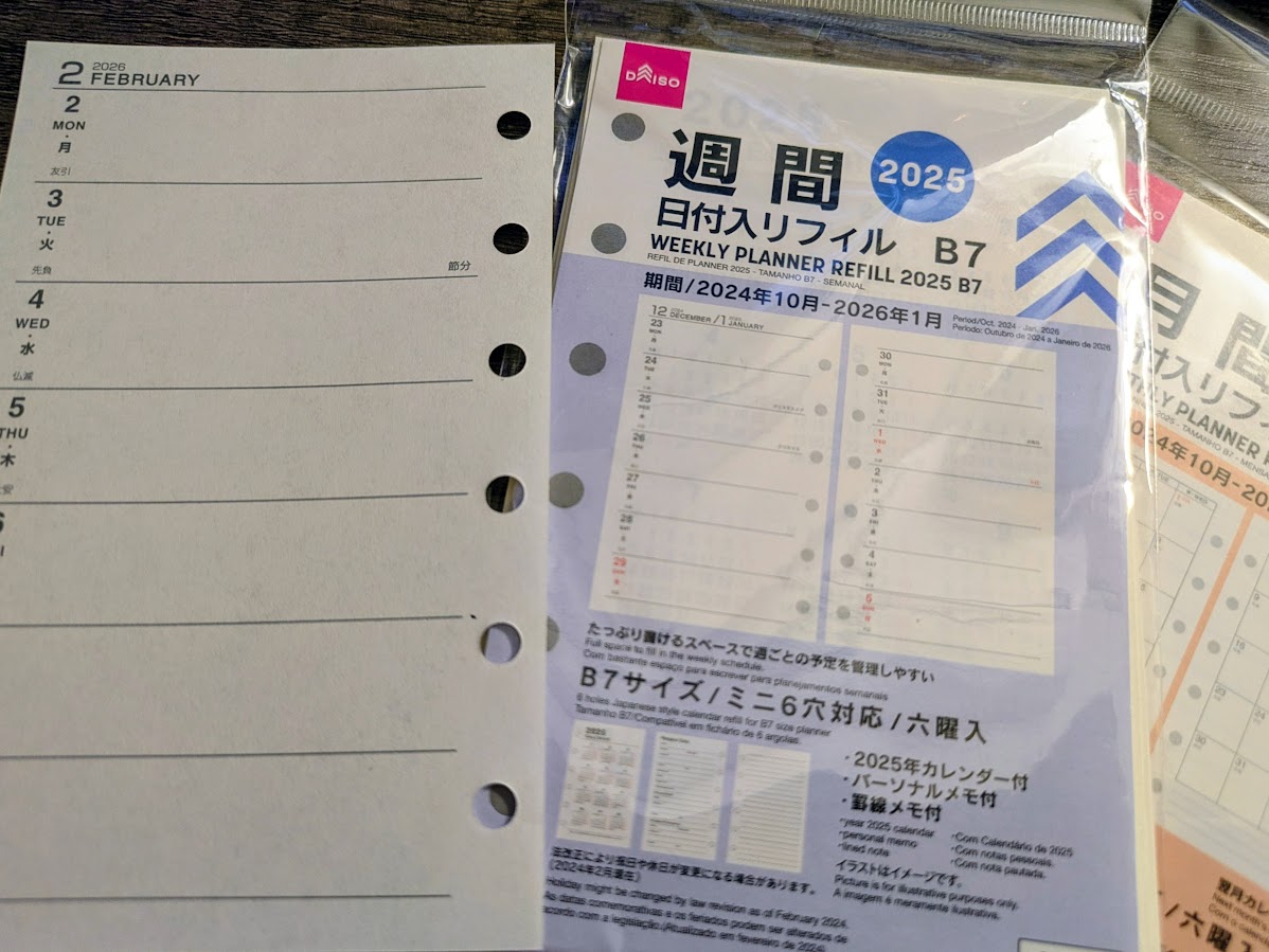 手帳オタクさんにはおなじみの、100円ショップDAISOの週間リフィルを使っています。文具メーカーのを買うと1000円前後はするであろう、この年間ウィークリーリフィルがワンコイン100円で買えるとかいうびっくり。毎年買ってます。ありがとうすぎる。
